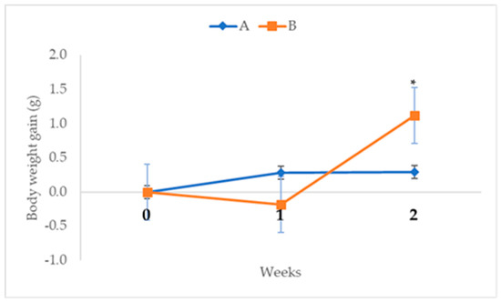 Weekly body weight gain (g) of female ICR mice in acute toxicity study of CELE. Key: CELE = Clinacanthus nutans ethanolic leaf extract, A = control, B = 2000 mg/kg CELE, * = significantly different at p < 0.05.