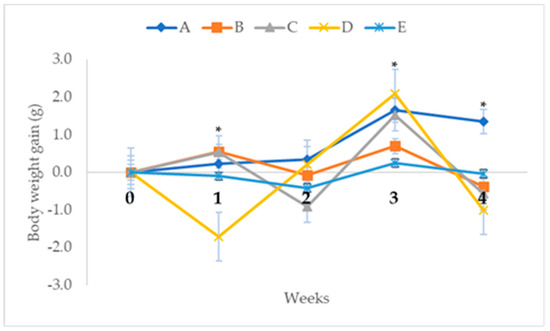 Average (mean ± SEM) weekly body weight gain (g) of female ICR mice in subacute toxicity study of CELE. Key: A = control, B = 125 mg/kg CELE, C = 250 mg/kg CELE, D = 500 mg/kg CELE, E = 1000 mg/kg CELE, ⃰ significantly different at p < 0.05, SEM = standard error of mean, CELE = Clinacanthus nutans ethanolic leaf extract.