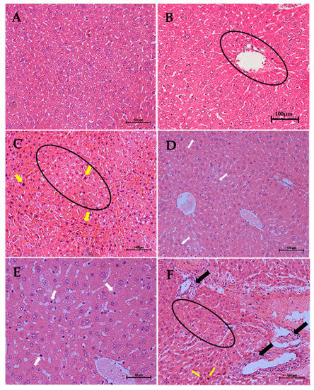 Effects of repeated oral administration of CELE for 28 days on the histology of liver of female ICR mice. Key: (A) Photomicrograph of a liver section (H&E stain ×200) from a mouse in group A (control) showing normal architecture of liver. (B) Photomicrograph of a liver section (H and E stain ×200) from a mouse in group A showing portal triad (encircled). (C) Photomicrograph of a liver section (H&E stain ×200) from a mouse in group E (1000 mg/kg CELE) showing eosinophilic cytoplasm (encircled) and pyknotic nuclei (yellow arrows) of the hepatocytes. (D) Photomicrograph of a liver section (H&E ×200) from a mouse in group E (1000 mg/kg) showing activated Kupffer cells (white arrows). (E) Higher magnification (H and E stain ×400) of D showing activation of Kupffer cells (white arrows). (F) Photomicrograph of a liver section (H and E stain ×200) from a mouse in group E (1000 mg/kg CELE), showing hepatitis (black arrows), eosinophilic cytoplasm (encircled) and pyknosis (yellow arrows) of the hepatocytes, H and E = haematoxylin and eosin, CELE = Clinacanthus nutans ethanolic leaf extract. Scale bars represent 100 µm.