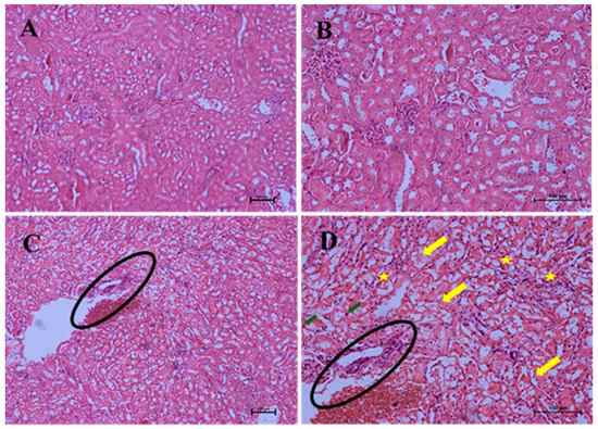 Effects of repeated oral administration of CELE for 28 days on the histology of kidney of female ICR mice. Key: (A) Photomicrograph of a kidney section (H and E stain ×100) from a mouse in group A showing normal architecture of kidney, (B) Higher magnification of A (×200), (C) Photomicrograph of a kidney section (H and E stain ×100) from a mouse in group E (1000 mg/kg CELE) showing cellular infiltrations (encircled) in the kidney. (D) Photomicrograph of a kidney section (H and E stain ×200) from a mouse in group E (1000 mg/kg CELE) showing cellular infiltrations in the kidney (encircled), protein casts (yellow arrows), eosinophilic cytoplasm (star) and pyknosis of the renal tubules (green arrow), CELE = Clinacanthus nutans ethanolic leaf extract, H and E = haematoxylin and eosin. Scale bars represent 100 µm.