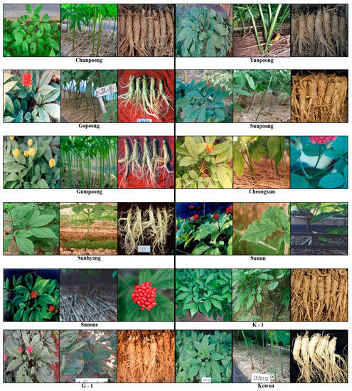 - Lee, J.H.; Lee, J.S.; Kwon, W.S.; Kang, J.Y.; Lee, D.Y.; In, J.G.; Kim, Y.S.; Seo, J.; Baeg, I.H.; Chang, I.M.; et al. Characteristics of korean ginseng varieties of Gumpoong, Sunun, Sunpoong, Sunone, Cheongsun, and Sunhyang. J. Ginseng Res. 2015, 39, 94–104. [Google Scholar] [CrossRef]