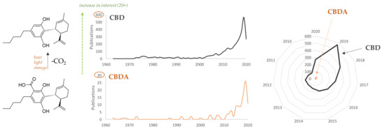 Number of papers dealing with the concept “CBD” or “CBDA” published in year range 1960–2020 (source: PubMed database, 18 April 2020). Data are plotted also through a radial chart that enhances, at one glance, the different interest in the two highly related compounds.