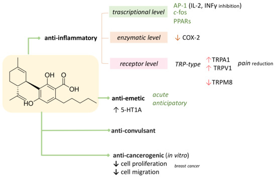 The potential CBDA anti-inflammatory activity continues to be the main focus for deepened investigations. In this context, studies based on systemic or oral administration before and/or after the inflammatory and irritating carrageenan were carried out [40]. In particular, it was evidenced that CBDA at 10 μg/kg exerted an anti-inflammatory action when administered intraperitoneally 60 min prior to carrageenan, whereas in rodents pre-treated with 100 μg/kg, delivered by oral gavage, carrageenan-induced hyperalgesia favorably decreased [40]. CBDA, intraperitoneally administered at 0.1 μg·kg−1 dose, also showed anxiolytic-like effects under conditions of high stress [41]. The brain and plasma pharmacokinetic profile of CBDA, as well as of other acidic cannabinoids, has been recently defined; the rapid absorption at plasma level and the extremely low brain/plasma ratio were positively modulated when CBDA was administered in an alternate Tween 80-based vehicle. The anticonvulsant in a mouse model of Dravet syndrome is also reported [42]. PPARγ, a nuclear receptor expressed in several tissues and cell types, involved in inflammation and neurodegeneration, was found to be activated in 293T cells transfected with a pair of GAL4-PPARγ/GAL4-luc plasmids by CBDA in a more efficacious way in respect to CBD at high concentrations [43].