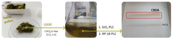 CBDA isolation and purification represent a prerogative of our latest laboratory activities. In particular, hemp pollen (HP), which is a resin produced by isolating the trichomes from the plant inflorescences by sieving process, was selected as CBDA source. HP was previously observed as a rich source of cannabinoids and flavonol glycosides [61], but GC-FID and GC-MS analyses, while highlighting the occurrence of 16 cannabinoids, were not able to analytically discriminate acidic from not-acidic compounds. Herein, hemp pollen, provided by Hemp Farm Lab farmers (Caserta, Italy), underwent ultrasound accelerated maceration (UAM) (Branson UltrasonicsTM BransonicTM M3800-E, Danbury, CT, USA). Exploiting the alternation of pressure and cavitation as useful means for cell decomposition and, therefore, for the release of the intracellular metabolic content, represented the starting point of our investigation. On the basis of the use of chloroform/n-hexane (1:1, v/v) as extracting solution, hemp pollen (10 g; drug/solvent ratio 1:5) underwent three extraction cycles (30 min each). A mixture enriched with cannabinoids was obtained (yield 26.5%).