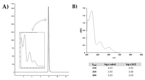 The chromatographic profile is shown in Figure 5A, together with the DAD spectrum, which is comparable to that reported in the literature [62]. In order to calculate the molar extinction coefficients at the three maxima absorption (λmax) exhibited by the compound, UV-Vis spectrophotometric analysis was carried out. The coefficients ε were in accordance with those previously reported in the literature (Figure 5B).