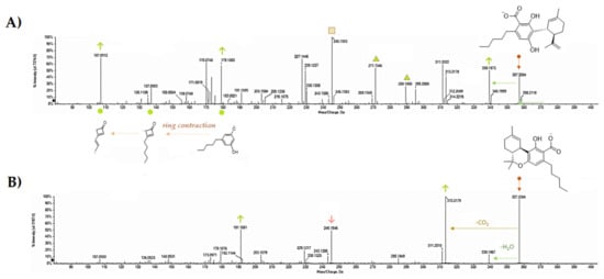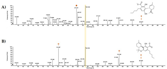 TOF-MS/MS spectra of CBDA (A) and Δ9-THCA (B) acquired using a hybrid Q-TOF MS instrument, the AB SCIEX Triple TOF® 4600 (AB Sciex, Concord, ON, Canada) and MS parameters were as follows: curtain gas (CUR) 35 psi, nebulizer gas (GS 1) 60 psi, heated gas (GS 2) 60 psi, ion spray voltage (ISVF) 4.5 kV, interface heater temperature (TEM) 600 °C, declustering potential (DP) −75 V, and collision energy (CE) −5. In TOF-MS/MS experiments, collision energy (CE) applied was −55 V with a collision energy spread (CES) of 35.