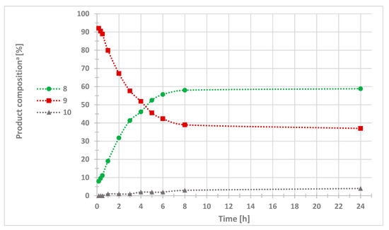 Applying the optimal parameters, the reaction time was also investigated. It was found that, during the first eight hours, the proportion of the desired dibutyl (1-benzyl-4-phenyl-1H-1,2,3-triazol-5-yl)phosphonate (8) increased, and the proportion of the 1-benzyl-4-phenyl-1H-1,2,3-triazole (9) continuously decreased (Figure 1). It should be noted that the dibutyl (phenylethynyl)phosphonate (10) did not form in a significant amount during the observed 24 h. Based on Figure 1, a reaction time of eight hours was considered as optimal for the domino reactions.