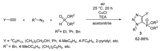 Several examples were reported on the preparation of 1,2,3-triazol-4-yl-phosphonates by domino or three-component reactions [33,34], however, to the best of our knowledge, only one example mentions the multicomponent synthesis of 1,2,3-triazol-5-yl-phosphonates [20]. Li and co-workers carried out the domino reaction of terminal alkynes, azides, and diethyl-, diisopropyl- or dibenzyl phosphite in the presence of copper(I) chloride as the catalyst (Scheme 1).