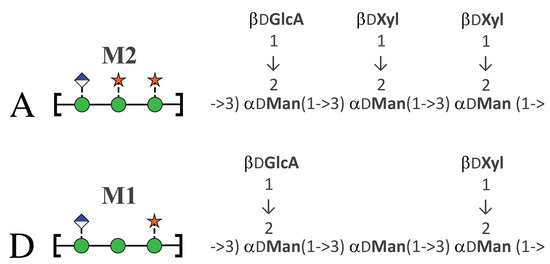 The serotype classifications for Cryptococcus are on the basis of antigenic differences arising from structural variations in GXM [6]. Light scattering and hydronamic studies suggest that GXM is a branched polymer comprising an (1→3) mannose backbone substituted with (→2) glucuronic acid every third mannose, along with variable (1→2) and (1→4) xylose side chains [7,8]. Some mannose residues are 6-O-acetylated (up to 60%) and O-acetylation plays a key role immune recognition of GXM [9]. The GXM polysaccharide has considerable heterogeneity [10]: in contrast to bacterial polysaccharides that have a single oligosaccharide repeat unit (RU), GXM has at least six repeat motifs (called triads), and a single molecule of GXM may include different motif combinations [11]. For each Cryptococcus serotype, the GXM structure has a major triad and one or more minor triads. For serotype A, the dominant triad is a six-residue RU with two (1→2) xylose side chains (triad M2), whereas serotype D has a dominant five-residue RU with one (1→2) xylose side chain (triad M1), as shown in Figure 1. Serotypes A and D have an estimated average of two acetates per triad [12].