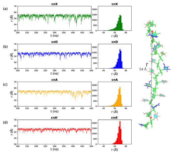 End-to-end distance, r, time series and corresponding histograms for the (a) cnX, (b) cnD, (c) cnA and (d) cnA’ GXM chains. The first 100 ns of simulation are considered equilibration and are not shown. Here r is defined to exclude the two terminal residues on either end of the chain, as the distance from O3 in the second linkage to O3 in the 16th linkage in the 18-mannose backbone—labelled for cnA in the image on the right. The residues and substitutions are coloured as follows: DMan—green; DGlcA—blue; DXyl—pink; and 6-OAc—red.
