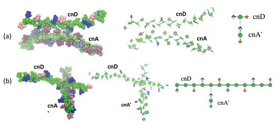 Examples of self-aggregation interactions between 6-RU strands of cnD and cnA in (a) parallel and (b) orthogonal arrangements. Molecules are depicted using the VMD [26] van der Waals representation (left); and the VMD PaperChain and Twister representations (middle) and a schematic (right). The saccharide residues are coloured as follows: DMan—green; DGlcA—blue; DXyl—pink; and 6-OAc—red.