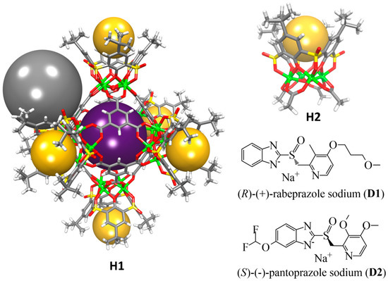 The crystal structures of host molecules (H1 and H2) based on the CIF files reported in the original literature [18,30] and chemical structure diagrams of guest molecules (D1 and D2) used in this study. The spheres serve to guide the eyes representing the endo cavity (purple), six exo cavities (yellow), and one of the eight external pockets (gray).
