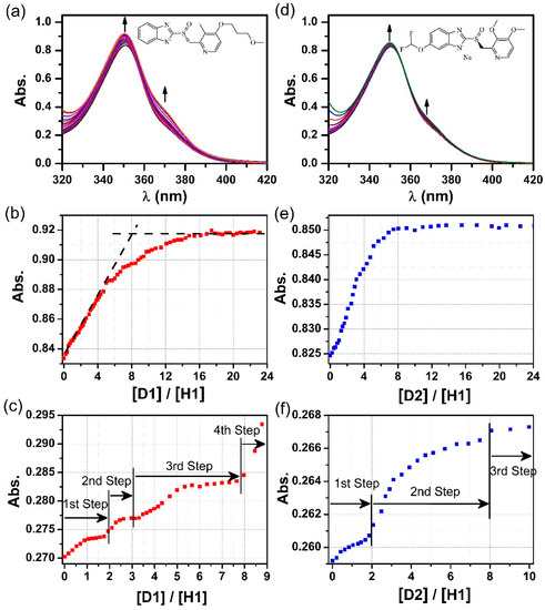 A plot of absorbance at 350 nm vs. D1 equivalents (Figure 3b) exhibits a characteristic sigmoidal kinetic profile typically observed in the binding of substrates by enzymes or receptors containing multiple binding sites [20,32]. At low guest concentrations, the D1 molecules added bind strongly to the H1, causing an initially flat and then sudden increase of the absorbance intensity. As the D1 equivalents continue to increase, binding of D1 guest to H1 appears to become weaker, leading to a deviation of the titration curve from the initial tangent and a much more slow and gradual increase of the absorbance until reaching a saturation plateau. The capability of D1 binding with H1 can be estimated to be ~8 equivalents according to the intersection point of the initial tangent and the asymptote.