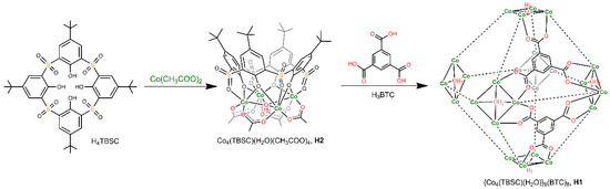 Over the years, considerable attention has been paid to coordination containers possessing a well-defined hollow space that is suitable for guest encapsulation and allows them to be widely applied in a number of applications, such as guest recognition [10,11,12], drug delivery [13,14], and supramolecular catalysis [15,16]. A new class of coordination containers, namely, metal-organic supercontainers (MOSCs), incorporating macrocyclic container thia- or sulfonyl- calix[4]arenes as precursors [17], have been well demonstrated by us and others [18,19,20,21,22,23,24,25,26,27,28]. The MOSCs are demonstrated to possess several unique features such as their modular synthesis, robust architecture, and multiple binding domains (containing both endo and exo cavities). The unique multicavity structures allow MOSCs to be promising in various applications including guest regulation [21,22,23] and electrocatalysis [24,29]. Although encapsulation of multiple guests by MOSCs through their multiple binding domains has been demonstrated [20], the exact mechanism of binding cooperativity and/or binding regulation of those synthetic receptors remains unclear.