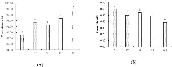 Change of (A) light transmittance and (B) color intensity in wine samples with different treatments. Different letters represent significant differences at a significant level of 0.05.