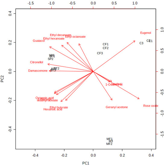 In order to explore possible differentiation among wine samples clarified by different technologies, principal component analysis (PCA) was applied to the data matrix containing the volatile compounds with OAV > 1 [20,34]. Although the interaction between compounds may be partially lost, these volatiles are the major compounds that contributed to the overall aroma of the wine samples. As principal components 1 and 2 (PC1 and PC2) represented 53.51% and 25.1% of the total variance respectively, approximately 80% of the total variance has been represented (Supplement Figure S1). The relationships/correlations between wine samples and compounds could be observed from Figure 2, where the control wine was positioned on the positive side of PC1, while SP and BT wine samples were located on the negative side. Nevertheless, the CF and MF wines were located on the positive and negative sides of PC2, respectively. In addition, rose oxide and eugenol were located on the positive side of PC1 while β-damascenone, citronellol, guaiacol, ethyl hexanoate, ethyl decanoate, octanoic acid, 1-hexnol, isoamyl acetate, ethyl butyrate, and hexanoic acid were located on the negative side (Figure 2 and Supplement Figure S2). In addition, these compounds played an important role in aromatic feature which distinguished the control wine from SP and BT wines. As for PC2, ethyl decanoate, ethyl hexanoate, eugenol, and guaiacol were located on the positive side, while octanoic acid, 1-hexnol, isoamyl acetate, ethyl butyrate, hexanoic acid, rose oxide, and geranyl acetone were located on the negative side (Figure 2 and Supplement Figure S2) which indicated that CF and MF wines could be separated by these compounds. Crandles et al. also found that most odor-active compounds were positively correlated with icewine cultivar and vintage combinations by PCA analysis [34].