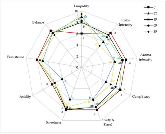 The icewines treated with different clarification treatments was assessed by sensory analysis to evaluate whether there were any perceivable differences among clarification treatments. As can be seen from Figure 4, clarification treatments could increase limpidity and decrease the color intensity of wine samples. Some researchers suggested that phenol compounds could be absorbed by fining or filtration, thus influence the color intensity of wine samples [17,37], which was in agreement with this study. For balance and persistence, there was no observed differences in the wine samples. Among all treated wines, BT showed the most significant influence on acidity, sweetness and complicacy. Moreover, the aroma intensity, fruity and floral for BT and MF wines were lower than other treatments, indicated that these treatments may have a negative effect on the aroma quality of the wine samples. However, there was no observed difference between BT and MF (Figure 4). In contrast, SP and CF treatments showed little impacts on wine aroma quality (the influence was not significant) which could be alternative method in icewine clarification.
