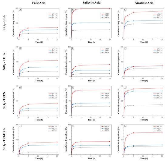 2.5. pH-Dependent Drug Release from the Drug-Loaded Hybrid Materials