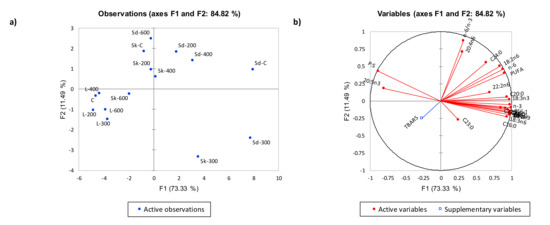 Principal Component Analysis (PCA) plots (a) score plot, (b) loading plot, for fatty acids content in control and high pressure processing (HPP) treated samples. Red and blue vectors indicate free fatty acids and thiobarbituric acid reactive substances (TBARS) measures, respectively. F1 (73.33%) and F2 (11.49%) explained a total of 84.82% variance. Cuts-Sd: Shoulder, Sk: Shank, L: Loin; HPP-200: 200MPa, 300: 300MPa, 400: 400MPa, 600: 600MPa. Kaiser-Meyer-Olkin (KMO) sampling adequacy: 0.717, detailed KMO values for each fatty acid can be found on Supplementary Table S1.