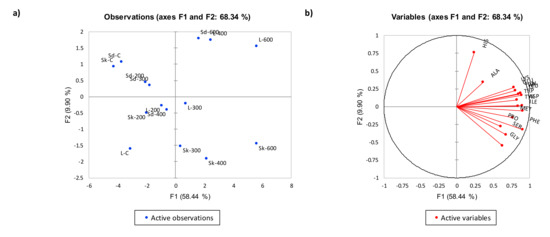 PCA plots (a) score plot, (b) loading plot, for free amino acids of control and HPP treated samples. Red vectors indicate free amino acids. F1 (58.44%) and F2 (9.90%) explained a total of 68.34% variance. Cuts-Sd: Shoulder, Sk: Shank, L: Loin; HPP-200: 200MPa, 300: 300MPa, 400: 400MPa, 600: 600MPa. Kaiser-Meyer-Olkin sampling adequacy: 0. 773, detailed KMO values for each amino acids can be found on Supplementary Table S2.
