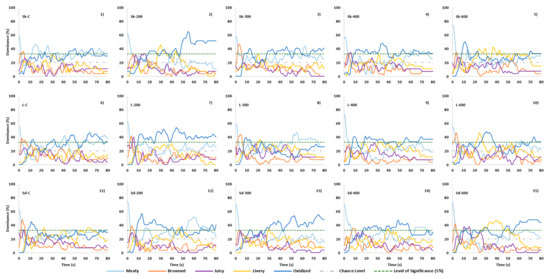 TDS curves distinguished the effect of HPP pressure and different cuts in terms of dominant sensory attributes of the samples. Figure 3 showed that all samples were dominant in terms of meaty, browned, juicy and livery attributes during the consumption period, and then oxidized thereafter. Meaty was the first dominant sensation in all samples with the dominance rates starting at over 50% dominance rate and then decreasing to below chance level in less than 10 s. Suzuki, et al. [2] suggested that free amino acids have an important role in determining brothy and meaty flavours, and as precursors of meat flavour. Dominance rate of the browned attribute increased from the start of consumption and reached a maximum in the first 3–5 s, then rapidly decreased to below chance level after 10 s of the consumption period. Starting from 11 s, oxidized became the dominant attribute above significance level until the end of consumption (except for Sk-C (1), Sk-200 (2), L-600 (9), and Sd-300 (13)). The attributes of livery and juicy were occasionally above the significant level, and only lasted a few seconds (except Sk600, L-600 and Sd-600). Oxidized and brothy were found to be the most dominant sensory attributes when using TDS to investigate the changes in beef muscles with PEF treatments [18]. However, to date there has been no reported studies that have investigated temporal changes in the sensory characteristics of high-pressure processed meat samples.