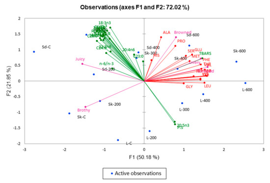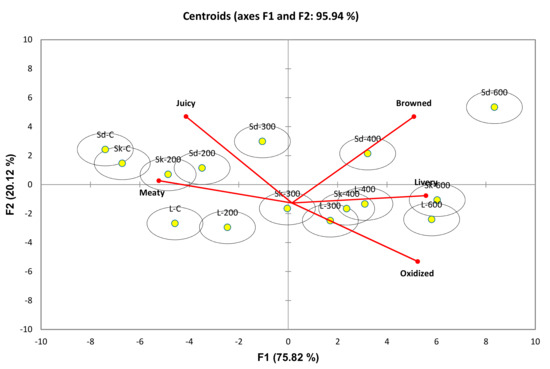 Samples that were subject to higher-pressure treatments were correlated with high amino acid content. Koutsidis et al. [44] reported that free amino acids, such as leucine, isoleucine, serine, threonine, valine, and phenylalanine contribute to brown/roasted attribute. TBARS values were closely associated with browned, oxidised, and livery sensory qualities. High TBARS value was strongly correlated with the oxidized attribute. In addition, at pressures of 400 MPa and above, the unsaturated lipids in the meat become more susceptible to oxidation, probably due to the release of iron from complexes present in meat (haemosiderin and ferritin) and/or changes in the lipid membrane [9].