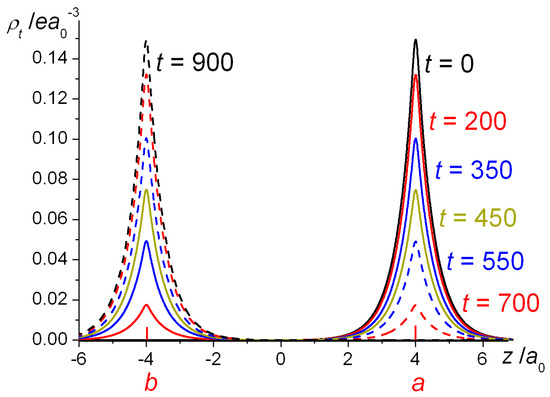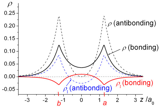 One-dimensional plots of the densities of H2+ as functions of the internuclear coordinate z as well as the resulting interference densities are shown in Figure 2. The bonding state’s wave function (Equation (1)) is an in-phase combination of the AOs φa and φb and their constructive interference results in a build-up of density in the bond region, i.e., in-between the nuclei, with a negative interference contribution close to the nuclei. The opposite holds for the antibonding state, i.e., negative interference in the bond region and an increased density around the nuclei. Note that the very existence of an antibonding state is a quantum effect, as it is the consequence of the quantum mechanical (wave) nature of the electrons. At R = 2.5 a0 its energy is 0.209 Eh above that of the separated atoms H + H+, i.e., it is a repulsive state, because of its large 0.316 Eh kinetic energy, despite an attractive −0.106 Eh potential energy contribution (both relative to H + H+). The large kinetic energy is a consequence of the node in the wave function, i.e., a region of large gradients (in an absolute sense), consistent with the quantum nature of the electron.