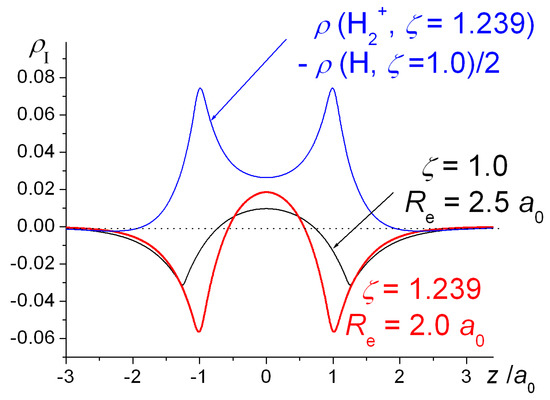 Interference density in H2+ for optimized exponent ζ = 1.239 and bond length Re = 2.0 a0 (red line), with nuclei at z = ± 1 a0, compared with interference densities for ζ = 1 and Re = 2.5 a0 (black line) and relative to H atoms with ζ = 1 (blue line) as functions of the internuclear coordinate z.