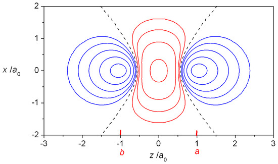 A more complete illustration of the magnitude and distribution of the interference density in H2+ is provided by the contour map in Figure 5, which clearly shows the movement of charge relative to the quasi (contracted) atoms as well as the sheet of zero ρI that separates the regions of density buildup and loss. The total charge QI that is actually moved into the interatomic (bonding) region can be computed by numerical integration [82,83] (although in the case of H2+ an analytic expression has been derived [50] and subsequently also used by Schmidt et al. [58,59]). Using the numerical information on the location of the zero ρI sheet, it is also possible to compute the kinetic and nuclear attraction energies associated with the charge movement, i.e., their values in the regions of positive and negative ρI.