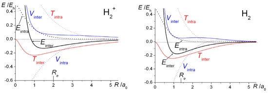 The computed intra- and interatomic energies of H2+ and H2 obtained using molecular wave functions with optimized AOs, as summarized in Equations (10)–(15) are shown in Figure 6. The interatomic energies are qualitatively the same as those obtained with ζ = 1 in Figure 1, in that for both molecules at all distances R the interatomic potential energies are repulsive. The interatomic total energy is attractive, except at small distances (less than ~ 0.8 a0 in H2+ and ~ 0.6 a0 in H2), due to the interatomic kinetic energies being negative, i.e., attractive, at all separations. The repulsive total kinetic and attractive potential energies that are observed as the AOs contract (see Figure 1) are entirely due to the intra-atomic components, as described in Equations (11) and (12) and shown in Figure 6.