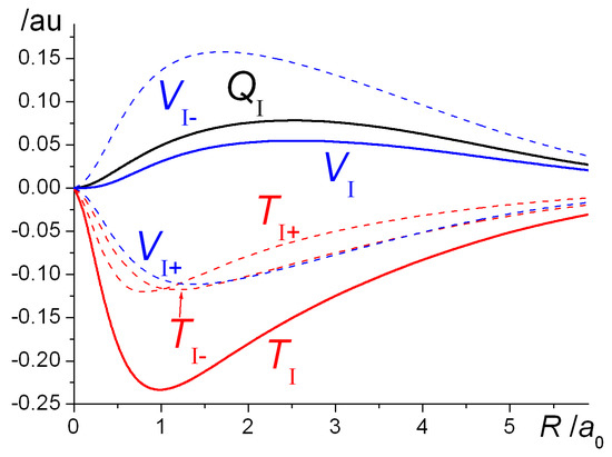 The interference density, ρI, being the difference between the molecular electron density and the sum of the constituent atom densities, reflects the charge rearrangement that occurs on bond formation (see Equations (6) and (7) and Figure 2, Figure 4 and Figure 5). As illustrated in the contour map in Figure 5, ρI consists of a region of positive values (ρ+) in the interatomic i.e., bond region and a region of negative values, the two separated by sheets of zero density. Integration of the charge density over the ρ+ region results in QI, the total electronic charge transferred into the bond. (Note that positive QI corresponds to charge build-up, i.e., the negative sign of the electronic charge is not taken into account). Integration of the analogous kinetic and electron/nuclei energy distributions yields TI+ and VI+ as well as VI+ and VI−, the sums of which result in the total kinetic and potential interference energies TI and VI. The former is equal to the interatomic kinetic energy Tinter, while Vinter includes a quasi-classical contribution in addition to the interference term, as given in Equation (16). The results of the integrations are summarized in Figure 7 that shows the internuclear distance dependence of the various terms discussed above.