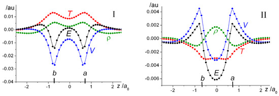 i.e., the plots in Panel II of Figure 8 can be interpreted as the effects of contraction on the properties of interest: density, kinetic, potential, and total energies. Thus, the decrease in total energy, brought about by orbital contraction, is due to the drop in the interference component of the kinetic energy. These observations are in complete accord with the findings of Schmidt et al. [58,59], whereby orbital contraction enhances delocalization, i.e., the transfer of electron density to the interatomic region that results in a lowering of the kinetic energy and hence a lower total energy.