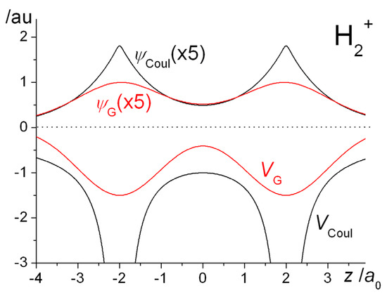 A one-dimensional illustration of the similarities and differences between the Gaussian and Coulomb potentials and the resulting wave functions in H2+ is provided in Figure 9. The important double well nature of the Gaussian potential is obvious, as are the qualitative differences between the two potentials, in particular the finite depth of VG at the nuclei. Consequently, the most striking difference between the wave functions is the absence of the nuclear cusps in ΨG. While the two wave functions are qualitatively quite similar, the question is whether the energetic trends that occur on covalent bonding are essentially the same.