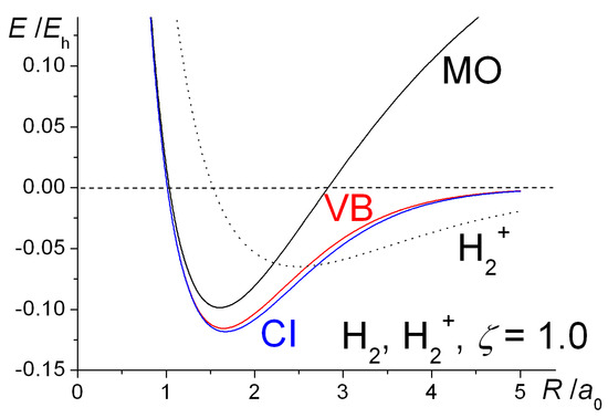 is dependent on the orbital exponent ζ and the internuclear separation R. (The full wave functions for the ground states are obtained by multiplying the above spatial functions by the doublet and singlet spin eigenfunctions for H2+ and H2, respectively). The H2 wave function of Equation (2), being the linear combination of atomic configurations, is the archetypal VB wave function [15,16], as originally proposed by Heitler and London [11]. The coordinates of the two electrons are simply written as 1 and 2. Because it smoothly dissociates to H atoms, in this work it is preferred to the MO wave function (i.e., a doubly occupied σg MO) that predicts a mixture of H atoms and H+/H− ions as R → ∞. We note, however, that in the case of H2+ the single electron wave function of Equation (1) could equally well be regarded as MO or VB type. The normalized AOs are just 1s-type AOs, e.g.,
