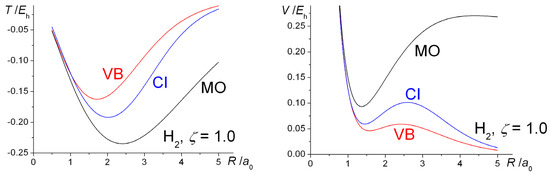 where is the kinetic energy operator, VN is the nuclear repulsion energy, is the inter-electron repulsion operator in H2 and and are the potential (nuclear attraction) energy operators. The interference component of the kinetic energy, TI, is actually the same as the interatomic term, Tinter. Clearly, increasing the orbital exponent results in a tighter AO, i.e., an increase in its kinetic energy and a corresponding decrease in its potential energy of attraction to the nuclei as summarized by the above Equations (11) and (12).