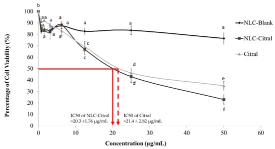 The percentage of viable 4T1 cells treated with different concentrations of NLC-Blank, NLC-Citral, and citral at 48 h in MTT assay. Each value is represented as mean ± SD and the experiment was done in triplicate. The red line indicates how the IC50 for NLC-Citral (full red line) and Citral (dotted red line) was obtained. Significance indicated by different alphabet was set at p < 0.05 comparing between groups.
