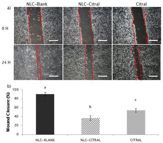 The representative images and bar chart analysis of wound healing treated with 26 µg/mL (IC40) of NLC-Citral, citral, and NLC-Blank for 24 h. The wound closure was measured in between the wound scratched. Each value in the bar chart is represented as mean ± SD and the experiment was performed in triplicate. Significance indicated by different alphabet was set at p < 0.05, comparing between groups. The scale bars show 500 px (13.2 cm).