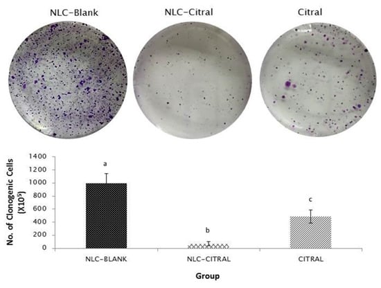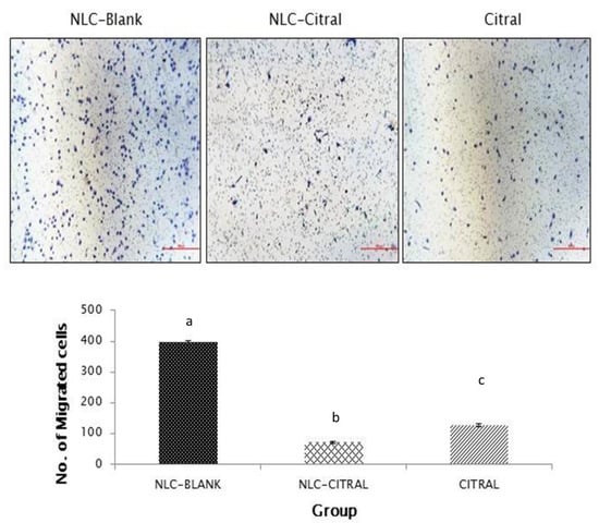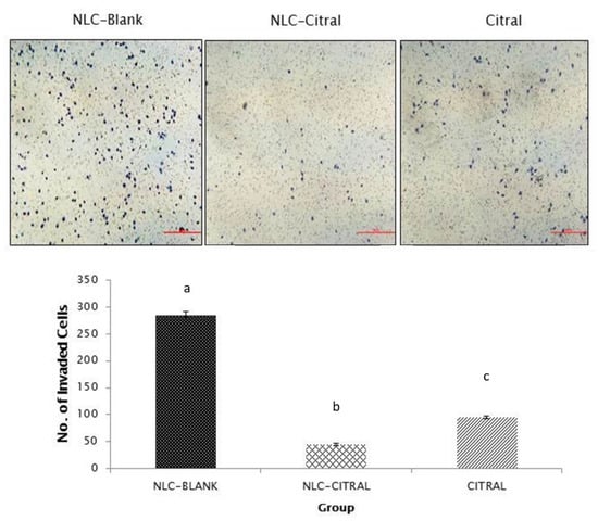 The representative images and bar chart analysis of invaded 4T1 cells through the transwell membrane after 24 h of treatment with 26 µg/mL (IC40) of NLC-Citral. The number of invaded cells was counted based on the presence of the blue dye stained cells. The images were viewed at 200× magnification. Each value in the bar chart is represented as mean ± SD, the experiment was performed in triplicate. Significance indicated by different alphabet was set at p < 0.05 comparing between groups. The scale bars show 500 px (13.2 cm).