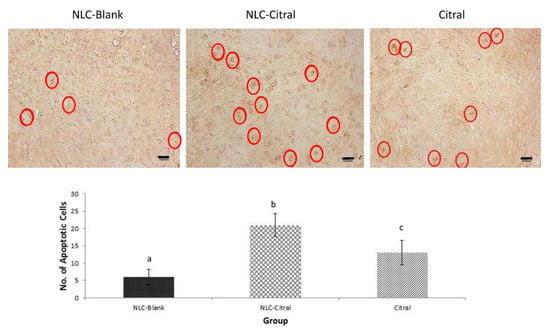 The representative images and histogram analysis of TUNEL assay of tumor from NLC-Blank, NLC-Citral, and citral groups. The red circle illustrates the DNA fragmentation detected in the tumor sections. The magnification viewed was at 100×. The scale bar shows 100 µm. Each value in the bar chart is represented as mean ± SD and the experiment was performed in triplicate. Significance indicated by different alphabet was set at p < 0.05 comparing between groups.