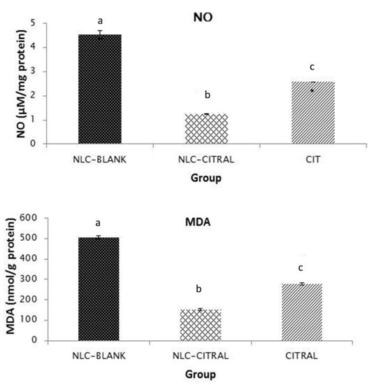 In the in vivo analysis, the levels of lipid peroxidation of MDA and NO in the 4T1 tumor treated with NLC-Citral, citral, and NLC-Blank were measured. There was a significant reduction of the NO level in NLC-Citral (1.23 ± 0.16 µM/mg) and citral (2.5 ± 0.31 µM/mg) treated mice as compared to NLC-Blank (4.53 ± 0.86 µM/mg) (Figure 6). Similarly, the level of MDA has significantly reduced (p < 0.05) to 151 ± 5.45 nmol/mg in NLC-Citral from 506 ± 7.07 nmol/mg in NLC-Blank while at 278 ± 3.07 nmol/mg respectively.