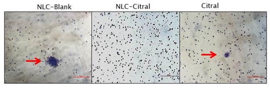To test the anti-metastasis effects of NLC-Citral on 4T1 cells, the clonogenic and bone marrow smearing assays were conducted. As depicted in Figure 7, the clonogenic assay showed a significant (p < 0.05)14-fold reduction in the numbers of 4T1 colonies metastasized to the lung of the NLC-Citral group as compared to NLC-Blank. While in the bone marrow smearing assay, the metastatic 4T1 cells were identified by the presence of abnormal clumped-cells in the NLC-Blank and citral groups while it was absent in the NLC-Citral group (Figure 8).