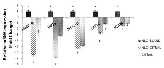 The relative mRNA expression level of MMP-9, iNOS, NFK-β, C-MYC, and ICAM. Each value is represented as mean ± SD and the experiment was performed in triplicate. Significance indicated by different alphabet was set at p < 0.05 comparing between groups.