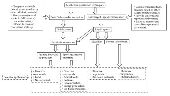 Though a few reviews are available on SMS applications [6,7], no review is currently available on extraction of bioactive compounds from mushroom by-products and its potential applications in different fields, such as food, animal feed, fertilizer, bioremediation, energy production and bio-based materials. To the best of our knowledge, this is the first review on valorization of mushroom by-products, in different fields, resulting from the two mushroom production techniques (solid substrate fermentation only or including submerged liquid fermentation steps). It is well known that mushroom production is obtained from solid substrate fermentation, but the production process can include submerged liquid fermentation to produce liquid spawn for mushroom production. Therefore, this review aims to present and discuss the potential applications of mushroom by-products being focused on the extraction of bioactive compounds which could result in nutraceuticals with high economically value.