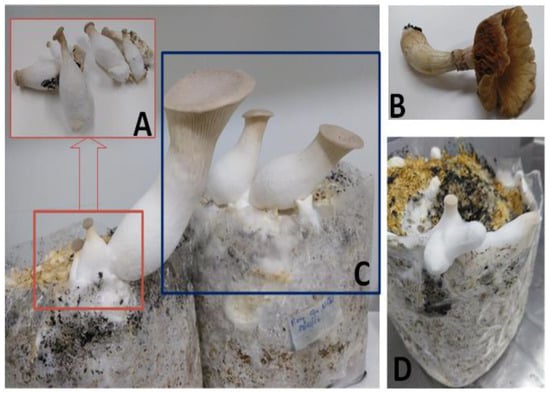 Mushroom by-products obtained by solid substrate fermentation only. (A) and (B) are mushroom production wastes (stipes and mushrooms that do not comply with commercial standards in terms of caliber, shape or size: 5–20% of the production weight); (C) by-products (surplus production: ≤ 5%); (D) spent mushroom substrate (>20% of the production weight). The photos were graciously supplied by Voz da Natureza.
