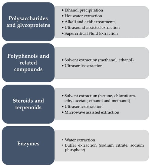 The following section describes the main bioactive compounds and extraction methods from mushroom by-products (Figure 3) obtained either by solid substrate fermentation only or including submerged liquid fermentation in the production steps.