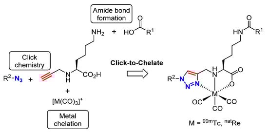 - Kluba, C.A.; Mindt, T.L. Click-to-Chelate: Development of technetium and rhenium-tricarbonyl labeled radiopharmaceuticals. Molecules 2013, 18, 3206–3226. [Google Scholar] [CrossRef] [PubMed]