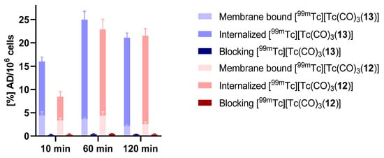The lipophilicities (LogD) of [99mTc][Tc(CO)3(L)] (L = 12, 13) were determined by their partition coefficient between n-octanol and PBS (pH 7.4) utilizing the “shake-flask method” [25,26]. PBS and n-octanol were shaken overnight to saturate each phase. After separation of the layers by gravity, equal volumes (500 µL) of each layer were taken and transferred into an Eppendorf tube and 5 µL (~45 kBq) of the radiolabeled peptide solution were added to the PBS/n-octanol mixture. The resulting solutions were mixed in a shaker at room temperature for 20 min and centrifuged at 3000 rpm for 10 min. Aliquots of 300 µL were removed from the octanol and PBS phases and the radioactivity was measured in the γ-counter (n = 3 in triplicates). The lipophilicity was calculated as the log value of the average ratio between the radioactivity in the organic fraction (octanol) and the PBS fraction from the samples.