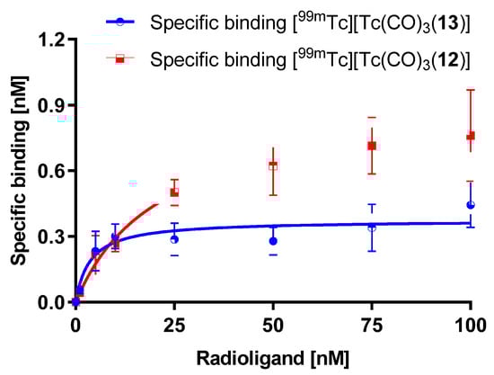 Receptor binding assays were performed as previously published [23]. PC-3 cells were prepared in 6-well plates as described above for the internalization experiments. Approx. one hour before the experiment, the medium was replaced with 0.8 mL fresh 1% FBS RPMI-medium. PC-3 cells were kept on ice for 30 min to stop receptor internalization processes prior to the start of the experiment. Afterwards, the cells were incubated at 4 ˚C with increasing concentration (1, 5, 10, 25, 50, 75, and 100 nM in NaCl; 100 μL/well, 5–600 kBq) of the radiolabeled peptides [99mTc][Tc(CO)3(L)] (L = 12, 13) to allow receptor saturation. Non-specific receptor binding was determined using an excess of natural bombesin (2.5 μM/well for concentrations of the radiopeptide <10 nM, and 10 μM/well for higher concentrations). After incubation at 4 °C for 2 h, the supernatant was collected and the cells were washed twice with 1 mL of ice-cold DPBS. The combined fractions represent the unbound radiopeptide. To determine the cell-bound fraction, the cells were lysed with 1 M NaOH (1 mL; 10 min; 37 °C, 5% CO2) and the wells were washed twice with 1 M NaOH (1 mL). The obtained fractions were measured in a γ-counter. Dissociation constants (Kd) and maximum receptor occupancy (Bmax) were calculated from the data for specific binding with nonlinear regression using GraphPad Prism 7 (n = 2–3 in triplicate).