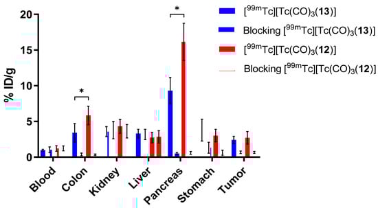 Biodistribution studies were performed in nude mice bearing PC-3 tumor xenografts at 1 h post-injection (p.i.) of the radiotracers (n = 6; Table 3, Figure 4). 2000-fold excess of BBN(1–14) was used as blocking agent and co-injected with the radiolabeled conjugate [99mTc][Tc(CO)3(13)] or [99mTc][Tc(CO)3(12)].