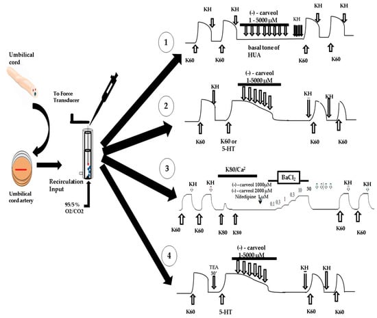Illustrative scheme of experimental protocols. (1) Schematic representation of the effect of (−)-carveol on the basal tone of the HUA. (2) Schematic representation of the effect of (−)-carveol on contractions sustained by K60 or 5-HT. (3) Schematic representation of the effect of (−)-carveol on BaCl2 contractions in the presence of K80 without Ca+2. (4) Schematic representation of the effect of (−)-carveol on sustained contractions induced by 5-HT in the presence of potassium channel blockers (tetraethylammonium—TEA). (* KH = Krebs–Henseleit solution).